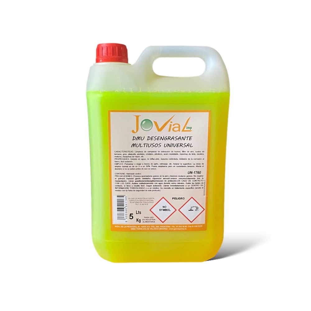 DMU- DESENGRASANTE MULTIUSOS UNIVERSAL es un producto de alta eficiencia diseñado para la limpieza y desengrase general de una amplia variedad de sustratos. Es ideal para campanas de extracción de humos, filtros de aire, suelos de terraza, gres, plaqueta, azulejos, cristales, plásticos, acero inoxidable, manchas de tinta, nicotina, motores, máquinas de vapor, entre otros. Diluir entre un 5% y un 30% del producto en agua, según el nivel de suciedad.