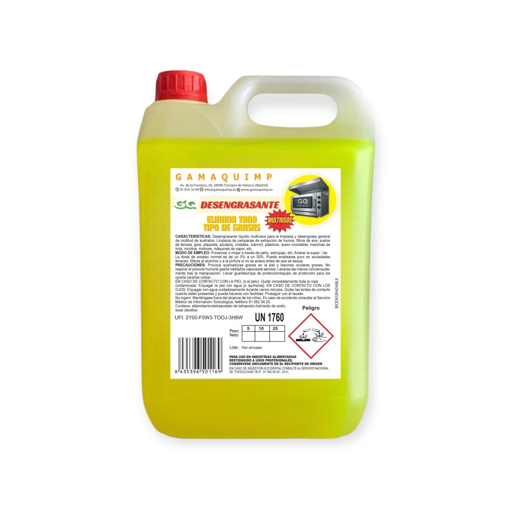GQ DESENGRASANTE, es un producto de alta eficiencia diseñado para la limpieza y desengrase general de una amplia variedad de sustratos. Es ideal para campanas de extracción de humos, filtros de aire, suelos de terraza, gres, plaqueta, azulejos, cristales, plásticos, acero inoxidable, manchas de tinta, nicotina, motores, máquinas de vapor, entre otros. Diluir entre un 5% y un 30% del producto en agua, según el nivel de suciedad.