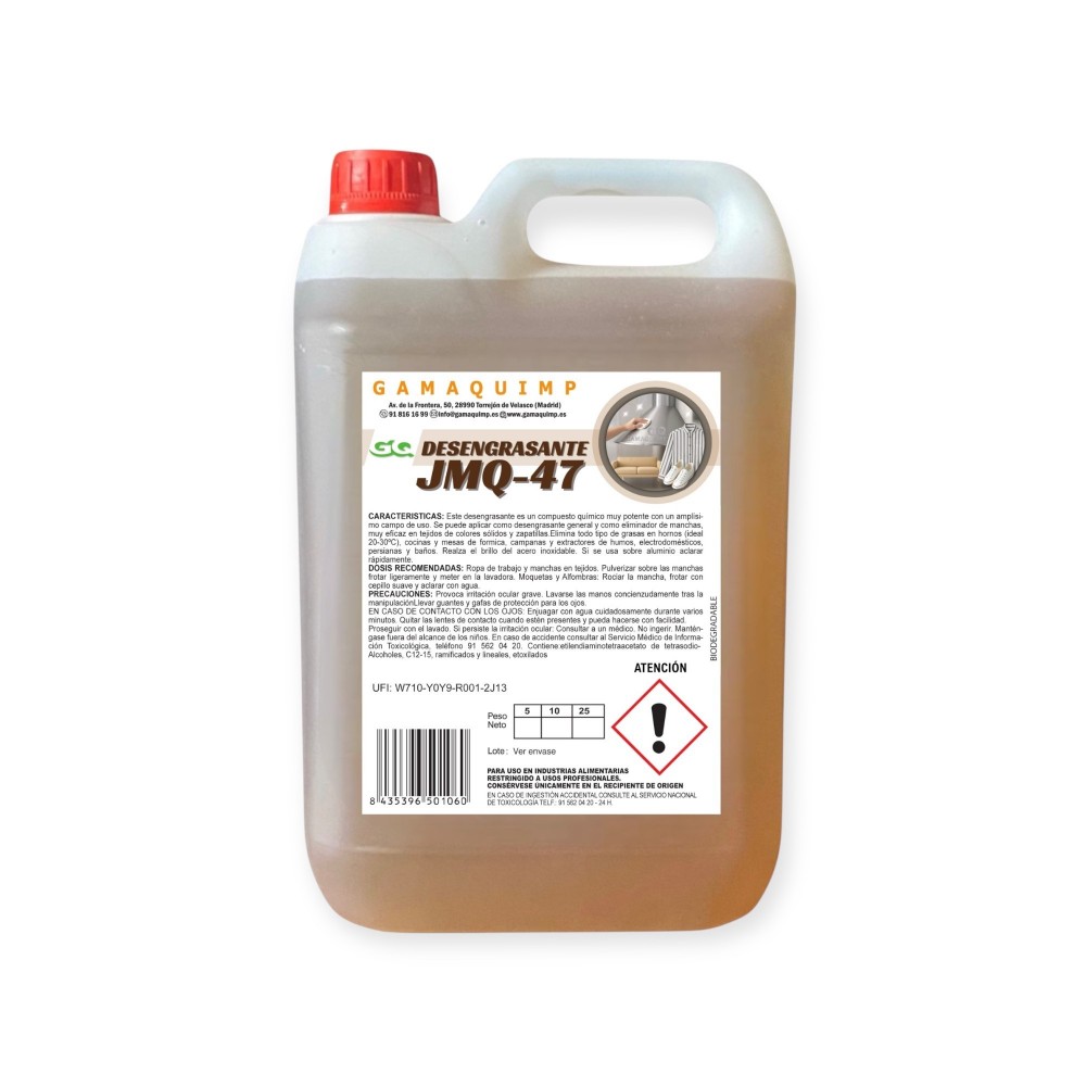 DESENGRASANTE JMQ-47 (quitamanchas) es un potente producto químico con un amplio espectro de aplicaciones. Su formulación versátil lo convierte en un excelente desengrasante general y eliminador de manchas, especialmente eficaz en tejidos de colores sólidos y en la limpieza de zapatillas. Ideal para facilitar la eliminación de grasa y residuos en áreas de cocina y hornos, este producto es un aliado confiable en la limpieza profunda de superficies difíciles.