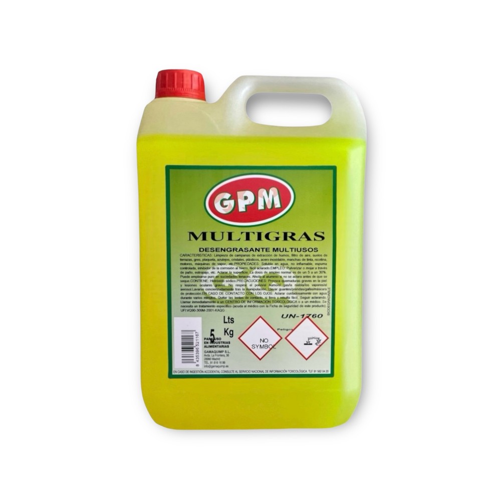 MULTIGRAS (desengrasante multiusos), es un producto de alta eficiencia diseñado para la limpieza y desengrase general de una amplia variedad de sustratos. Es ideal para campanas de extracción de humos, filtros de aire, suelos de terraza, gres, plaqueta, azulejos, cristales, plásticos, acero inoxidable, manchas de tinta, nicotina, motores, máquinas de vapor, entre otros. Diluir entre un 5% y un 30% del producto en agua, según el nivel de suciedad.